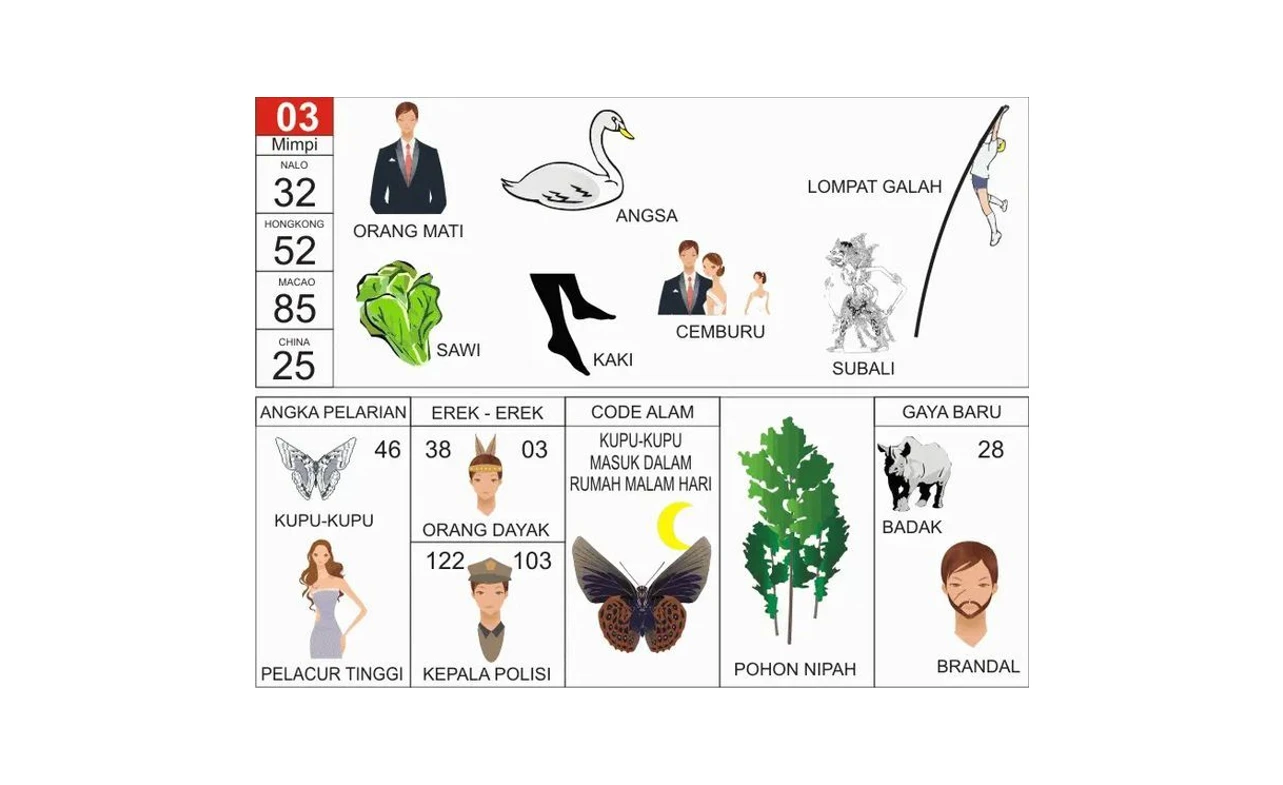 Dalam buku tafsir mimpi klasik, angka 03 sering dikaitkan dengan Orang Dayak dan Kepala Polisi (103). Simbol-simbol ini melambangkan kekuatan, ketegasan, dan kepemimpinan.