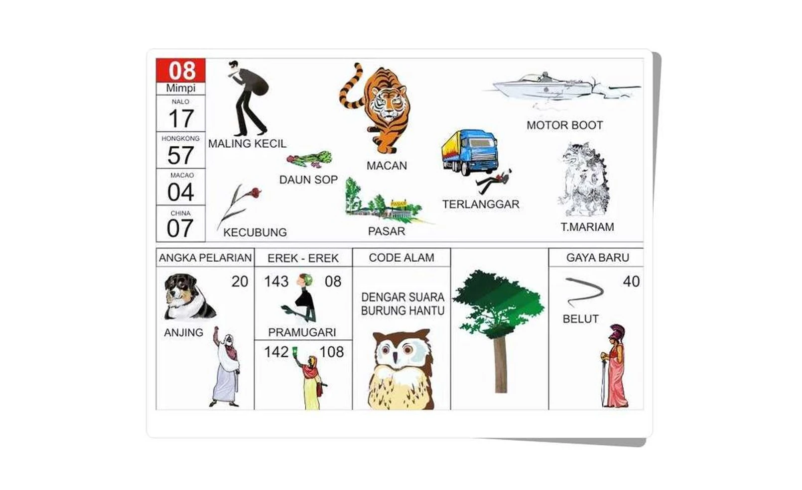 Dalam buku mimpi bergambar, angka 08 dikaitkan dengan beberapa simbol penting, antara lain: