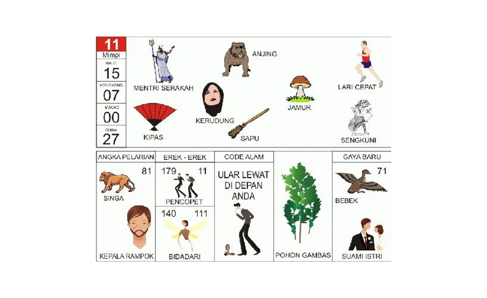 Dalam buku erek-erek, angka 11 sering dikaitkan dengan peristiwa mimpi yang melibatkan anjing, kipas, atau bahkan tokoh seperti Sengkuni. Masing-masing membawa tafsir berbeda: