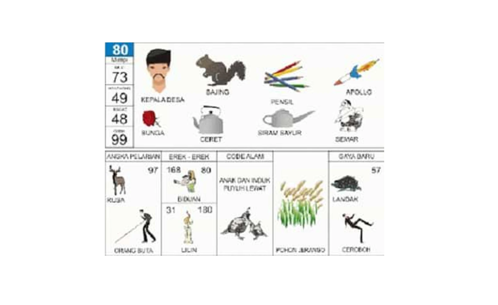 - Angka Pelarian: 49 (Burung Puyuh), 111 (Orang Bisu), 123 (Pelancong), 140 (Kolam Renang).