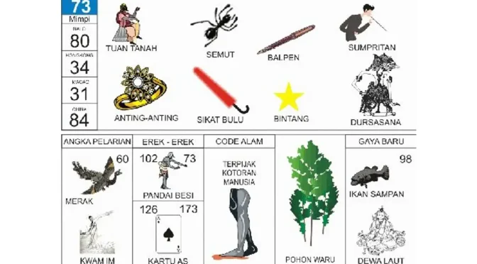 Pada gambar acuan, bintang ditampilkan sebagai simbol utama dengan nomor 73, yang biasanya berkaitan dengan mimpi atau visual tertentu.