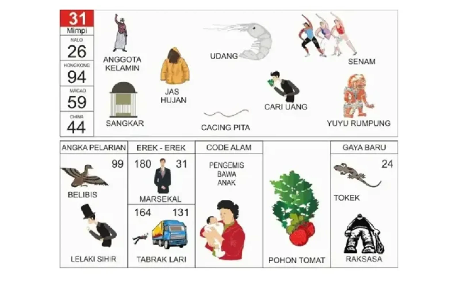 Cocokkan situasi atau simbol yang Anda alami dengan tabel sesuai kategori, lalu gunakan angka yang relevan sebagai referensi penafsiran.