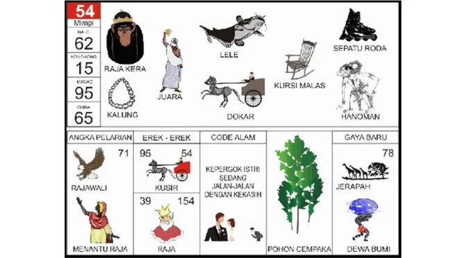 Dalam gambar erek erek 54, ikan lele muncul sebagai salah satu simbol utama. Ia dihubungkan dengan elemen juara, dokar, kursi malas, raja kera, sepatu roda, dan Hanoman. Semua simbol ini menandakan kekuatan, ketangkasan, dan daya tahan dalam menghadapi situasi yang penuh dinamika.